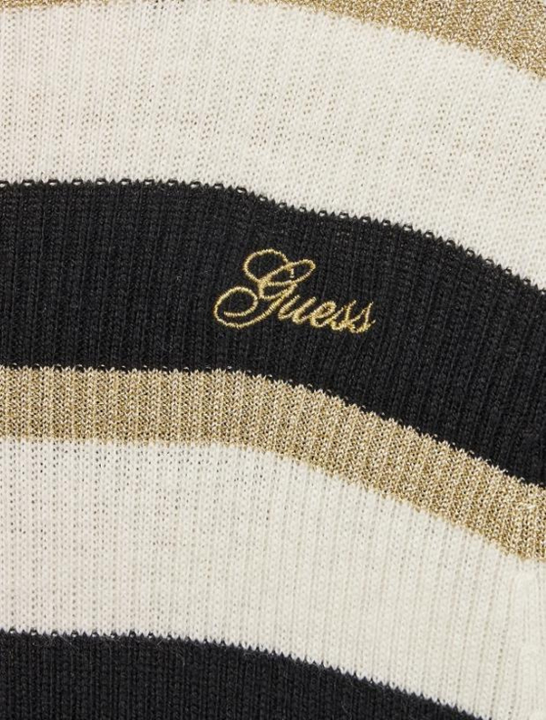 Artikelnummer: 858246 OverzichtGuess -Deze jurk van GUESS is heerlijk zacht en comfortabel door de combinatie van viscose en katoen. De jurk loopt vanaf de middel in een geplloide A-lijn uit in de rok. Het lijfje is aansluitend. De jurk heeft een omgeslagen kol . Het logo van GUESS staat in goud geborduurd op de linker voorkant. De strepen hebben een verschillende breedte en een schakering van de kleuren ecru, zwart en goud.